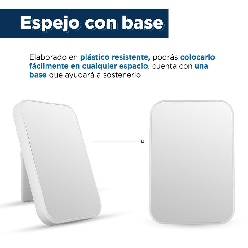 • Espejo rectangular ideal para mesa o tocador. Marco de plástico blanco. Base recargable para ajuste de posición.